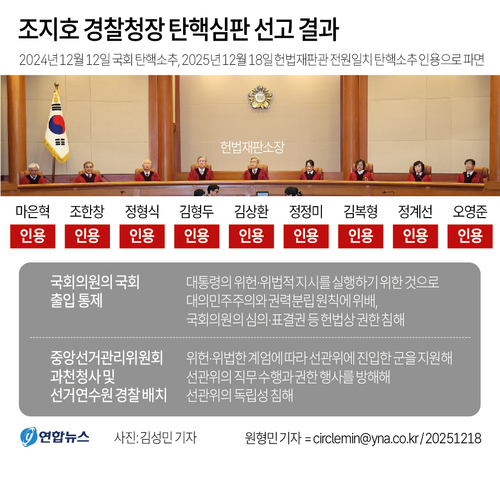 ■윤석열 전 대통령의 비상계엄에 가담한 혐의로 조지호 경찰청장이 파면됐습니다. 헌법재판소는 조 청장이 민주주의의 근간을 훼손했다고 판단했으며, 조 청장 측은 같은 사례가 반복되지 않기를 바란다는 입장을 밝혔습니다.