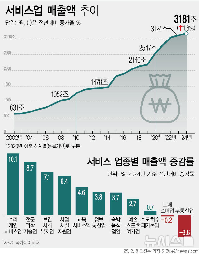 ☞서비스업 매출 ‘역대 최저 성장’… 3,000조라는 착시 속, 성장 동력은 갈라졌다...도소매·부동산이 끌어내린 성장률 1.8%...AI·돌봄은 커졌지만, 소비 허리 무너졌다
