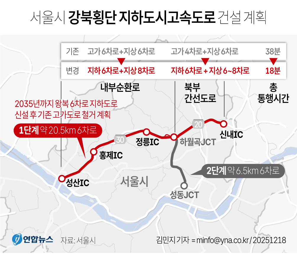 ☞내부순환·북부간선도로 지하화…오세훈 "2037년 완공 목표"...3조4000억 투입…왕복 6차로 지하 고속도로 신설...고가도로 철거 및 지상도로 추가 확보…시간 단축...2030년 착공…"강북 전성시대 핵심동력이자 결정체"